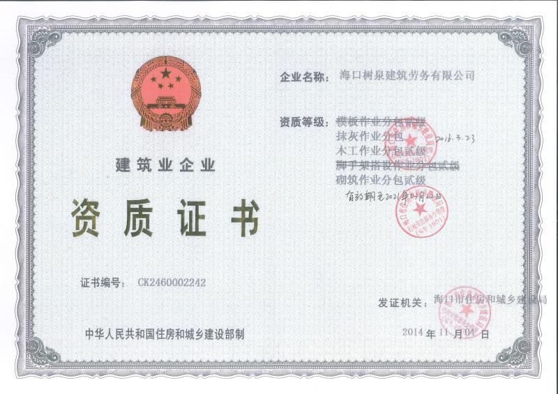 ??跇淙ㄖ趧沼邢薰境闪⒂?011年,公司位于海口,其前身是一家專業建筑施工隊,自2004年即開始在海南從事建筑勞務施工。自成立至今,公司已經擁有一支科學管理、質量過硬、能打硬仗,搶工期的專業隊伍。能獨立承擔大中型工業與民用建筑 、室內外裝修、各類機電設備安裝工程。代表工程有海口濱海華庭、三亞時代海岸T01/02/04/05棟高層、合肥東海花園二期、陵水富力灣B區高層、三亞金中海(酒店)、瓊海大印經典花園、??诃h球海景大酒店(四星級酒店,在建中)、陵水珍珠大廈(五星酒店)、??谌f達廣場、美蘭機場二期。